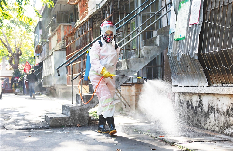 近日,在海口市龙华区疏港社区,环卫工人郑德霞对一小区的楼梯口喷雾消毒。据郑德霞所在的环卫公司负责人介绍,环卫公司积极响应“四爱”卫生健康大行动号召,环卫工人严格按照要求开展消杀工作,为复工复产的有序开展提供保障。 本报记者 李天平 摄