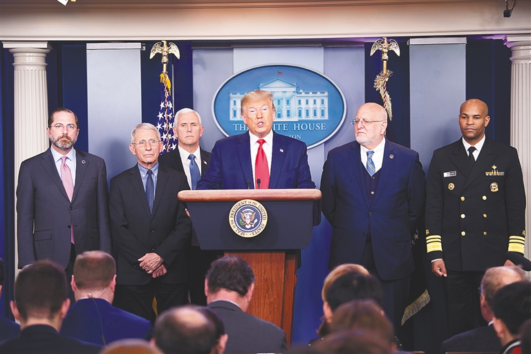 图为美国总统特朗普(右三)参加白宫记者会。 新华社记者 刘杰 摄
