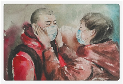 一位母亲用双手捧着儿子的脸,眼中噙满泪水,儿子的目光坚定而柔软,虽然两人都戴着口罩,但不舍之情溢于画面。这是青年画家金晓曼的水彩作品《母亲》,画的是一位母亲送医生儿子去武汉的离别场景,画面温情脉脉、令人动容。“世界上没有从天而降的英雄,只有挺身而出的凡人。网上有句话说得好,哪有什么白衣天使,只不过是一群孩子脱下便装,换上白大褂,学着前辈的样子,治病救人,与死神抢人。”金晓曼说。