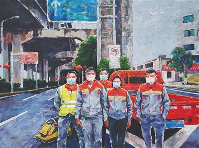 人生哪有什么岁月静好,只是有人替我们负重前行。疫情当前,有这样一群不回家的人,他们告别“小家”为“大家”,坚定“逆行”赴“战场”,和众多白衣天使一样,冲锋在疫情防控第一线。画家陈雄的油画作品《逆行者·道路抢修班》就是描绘在这场没有硝烟的战“疫”中坚守岗位的工人形象,他们在岗位之“家”,上演着一段段温暖人心的家国故事。