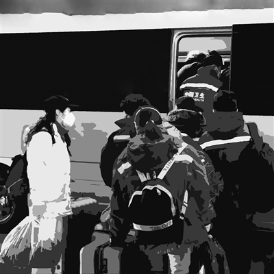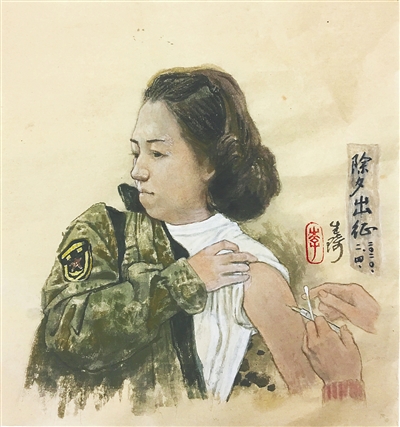 “作为一名画家,不懂拿手术刀,不会用听诊器,不能冲到治病救人的第一线,只有把自己在新闻上看到的最动人的故事记录下来。”画家李生琦的中国画作品《除夕出征》描绘的是网上一张广为流传的照片,身穿军装的女医生正在接种胸腺肽。“我把画面焦点集中在了医士头部、扎针的胳膊和另外一位护士的双手。”李生琦说,“之所以想这样画,是想刻画一种面对生死的坦然和担当。”