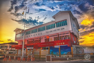 除了让访客从舌尖上体验海南饮食文化,会馆也没有让墙壁和空地闲下来。在礼堂入口,巨大的咖啡杯雕塑吸引游人拍照,在这个象征海南人传统行业的雕塑上别出心裁地印着“居安思危”四字,在提醒着乡亲们,祖先的基业与文化传承不易!在庭院外墙,几幅鲜艳的壁画吸引游人合影留念,其中有曾经风靡全马的森州琼剧团剧照和海南的“天涯海角”风光图。“海南山鹧鸪是海南岛的特有物种,也是中国国家一级保护动物……”陈川正向笔者介绍这幅“天涯海角”的沙滩上还绘着海南特有的几种鸟类,向乡亲与游人展示祖籍地海南的自然风光!