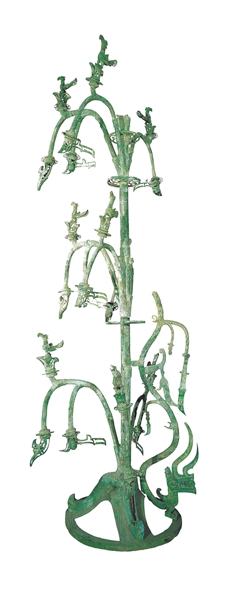中国的古代神话中,有十日并行危害百姓,引发后羿射日的故事。此外,不少志怪书籍中还有神树与太阳运行密切相关的传说。《山海经·海外东经》中记有:“汤谷上有扶桑,十日所浴,在黑齿北。居水中,有大木,九日居下枝,一日居上枝。”《山海经·大荒东经》又记:“汤谷上有扶木,一日方至,一日方出,皆载于乌。”明确指出太阳是由金乌鸟背负,十个太阳轮流在扶桑木上停歇,便有了日出日落。青铜神树与扶桑树的造型极尽相似,是这些远古传说最直观的形象展示,而神树上未见的那只神鸟或许就是“居上枝”当值的太阳。