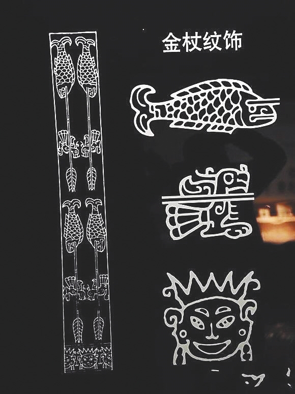 三星堆一号坑出土的第一件器物是金杖,长约143cm,一端刻有戴冠的人像,扛着箭的鸟,箭的末端还穿过鱼身。鱼和鸟的组合自然让人想到古蜀王鱼凫,凫一般是指水鸟,所以鱼鸟纹饰与人名完全契合。三星堆一、二号坑的年代一般认为是商末周初,此时中原地区已出现象形文字——甲骨文。三星堆遗址中并未发现明确的文字,如果这鱼和鸟的造型代表蜀王鱼凫,倒是与象形文字有异曲同工之妙。金杖的含金量很高,长度也方便人持握,造型与埃及和西亚地区常见的权杖很像,这都为此物是古蜀王权杖提供了侧证。