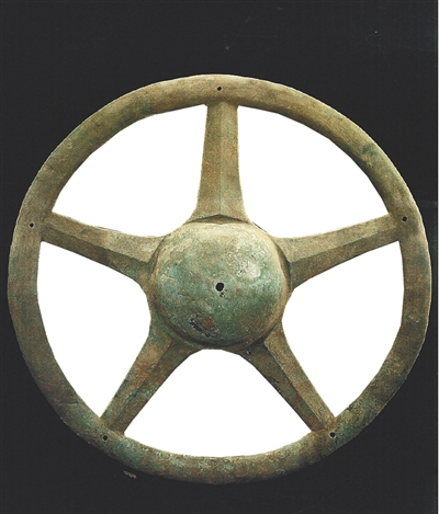 三星堆一号青铜神树又名“通天神树”,高约396cm,是已发现的体量最大的单体商周青铜器。这样的巨型青铜器,被古蜀人认为有通天之能也不足为奇。在一号青铜树的下端还有一条长约两米的巨龙,在古蜀人想象中,不知巨龙是金乌白日巡游的驾乘还是祭司们上天与太阳沟通的坐骑。除却神树,三星堆遗址还出土了形似方向盘的“青铜太阳轮形器”,五道支架被认为象征着从太阳散发出的光芒,可能是古蜀人在神庙中供奉的太阳象征物。