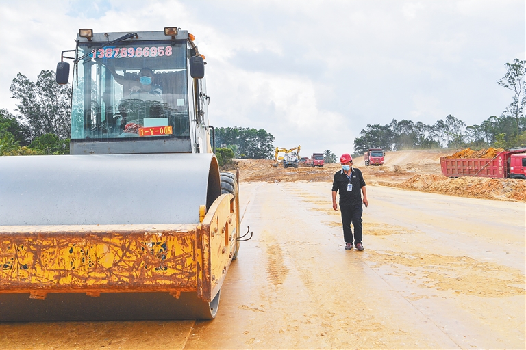 “这边来一辆压路机,将这片卡车拉过来的土方压实压平整,你们在做填土标尺的时候,不要太聚集了,尽量分散开来工作。”在琼山区海丰村昌头村民小组的国道G360文临公路琼山段WLTJ03标段项目施工现场,项目经理部经理王兴权一边指挥现场工作人员开展预制梁场土方工程建设,一边监督和提醒现场工人做好防疫。