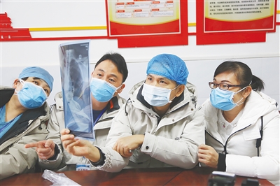 ① 3月3日,在湖北省洪湖市龙口镇卫生院,海南省支援湖北医疗队的李娜、陈志乐、张雪海、李清月4位医生(从左到右)根据患者的病情及影像学改变,对留观病区患者进行会诊评估。