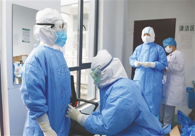 ③ 2月29日,在湖北省荆州市江陵县人民医院感染病区,来自海南省中医院的邓彩云(左一)和同事庞海清(左二)互相帮助穿戴防护服。 (本栏照片均由本报特派记者 袁琛 摄)