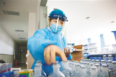 ② 2月29日,在湖北省荆州市江陵县人民医院,医护人员在准备药品。