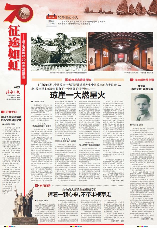 重温革命历史,感悟初心使命,激励奋斗奉献。为全面回顾海南解放的战斗历程和历史故事,生动展现革命先烈英勇奋战的光辉事迹和崇高精神,在全社会营造纪念、缅怀、崇尚、学习英烈的浩然正气和昂扬奋进的浓厚氛围,全力激发为加快推进海南自贸港建设作贡献、争创新时代中国特色社会主义生动范例的强大精神力量,从今日起,本报推出“征途如虹——纪念海南解放70周年特别报道”,开设 “70年前的今天”“琼崖革命遗址寻访”“海南解放英烈谱”等专栏,以此追忆解放海南的英雄史诗,追思革命先烈的慷慨忠魂,追寻涵育历史的精神养分,敬请读者关注。