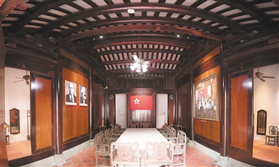 跨进二进的门槛,迎面墙上便挂着一面鲜艳平整的共产党党旗,党旗下头,是一张木桌和12张排椅。椅背雕刻花式考究,颜色却暗淡,仿佛岁月都化成了粒粒灰尘,钻进了这木制桌椅的每一处纹路中,日复一日,为它们罩上了历史的荣光。“这些物品都是我们为了还原当时的会议场景,而向社会征集的同时期的物件。”陈葵英介绍。