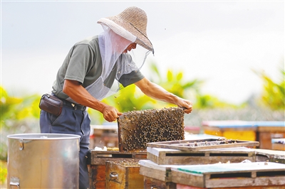 近日,海口市琼山区谭文墟荔枝园里,蜂农在采收蜂蜜。