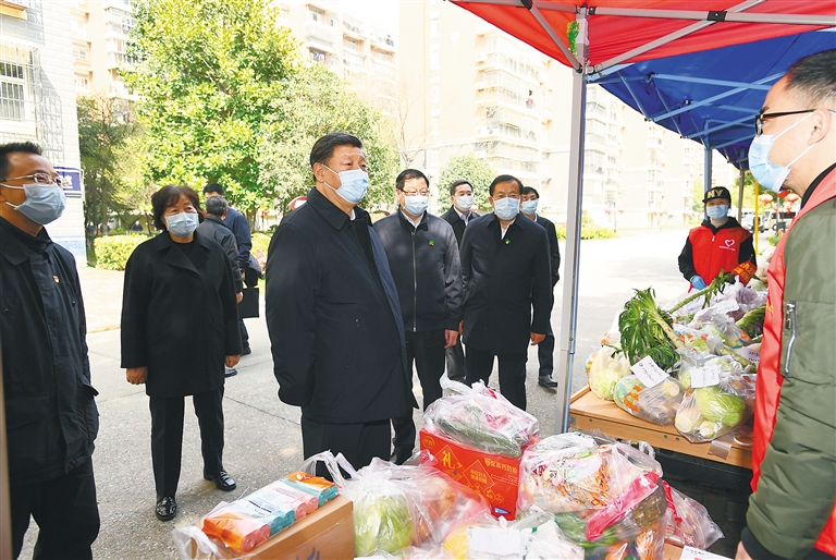 在社区生活物资集中配送点,习近平详细询问米面粮油和新鲜蔬菜水果等生活物资的采购和供应情况,强调要千方百计保障好群众基本生活。在察看社区警务室、卫生服务站、物业中心等运行情况后,习近平来到社区党群服务中心,了解社区实行网格化管理、联防联控、群防群治工作情况,对他们的工作表示肯定。