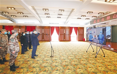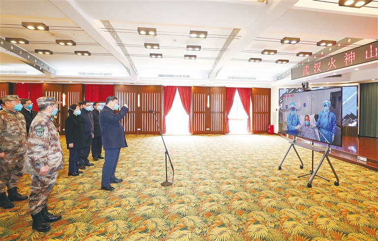 在火神山医院指挥中心,习近平听取医院建设运行、患者收治、医务人员防护保障、科研攻关等情况介绍。习近平指出,疫情发生以来,包括军队在内的广大医务工作者发扬特别能吃苦、特别能战斗的精神,义无反顾奔赴湖北和武汉,毫无畏惧投入防控救治工作,日夜奋战,舍生忘死,不负重托,不辱使命,同时间赛跑,与病魔较量,为武汉疫情防控工作作出了重要贡献。军队医务人员牢记我军宗旨,召之即来,来之能战,战之能胜,为党旗、军旗增添了光彩。沧海横流,方显英雄本色。你们真正做到了救死扶伤、大爱无疆。你们是光明的使者、希望的使者,是最美的天使,是真正的英雄!党和人民感谢你们!