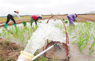 3月7日,在儋州市新州镇,农民忙着为缺水的稻田抽水灌溉,保障稻田能顺利插秧。时下,儋州市正多措并举保障复工复产,不误春耕农时。