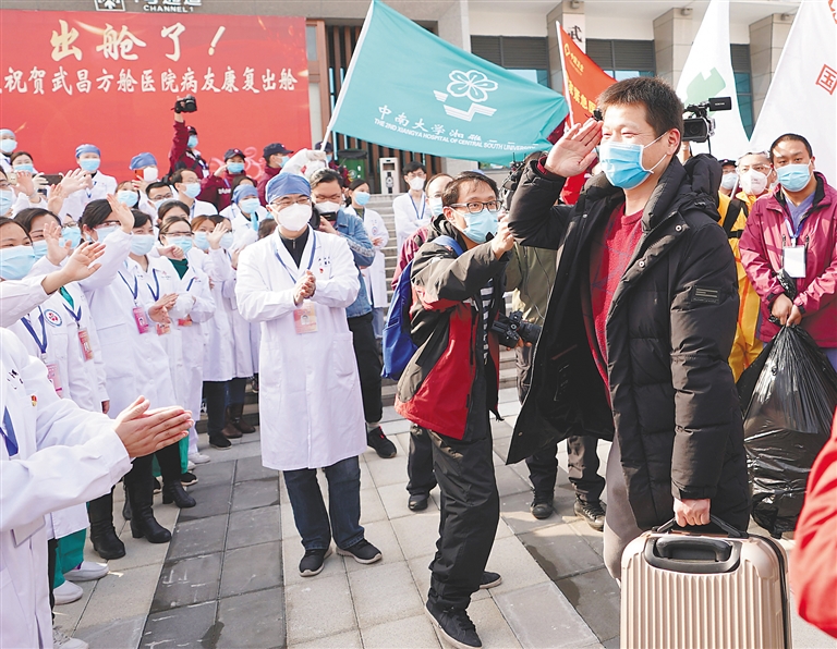 3月10日,新冠肺炎治愈患者(前右)向医护人员敬礼。 新华社记者 王毓国 摄