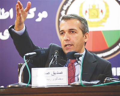 3月11日,阿富汗总统府发言人西迪克·西迪基在喀布尔举行的新闻发布会上讲话。