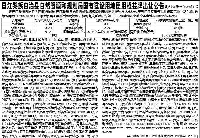 昌江黎族自治县自然资源和规划局国有建设用地使用权挂牌出让公告