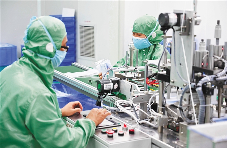 3月12日,海南海药股份有限公司新建的口罩生产线上,工人正在加紧生产医用口罩。该公司旗下海口市制药厂有限公司3月10日已获得海南省药品监督管理局出具的《医疗器械生产许可证》《医疗器械注册证》。三条生产线全部投产后,预计口罩日产量可达23万只。 该公司海南地区990多名员工目前全员在岗,多条生产线开足马力,产能利用率迅速恢复,确保抗生素类拳头产品充足供应市场。 截至目前,海口市医药行业50家企业全部复工复产,复工复产率为100%,产能恢复至去年同期水平的80%;返岗人数13170人,占该行业从业人员的99.4%。