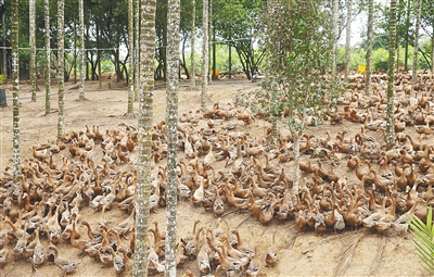 走出扶贫车间,一阵“嘎嘎”声传来。在扶贫车间不远处,一片槟榔林下,3000只蛋鸭成群觅食。