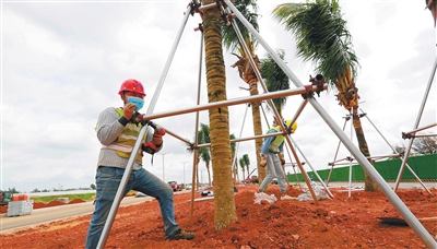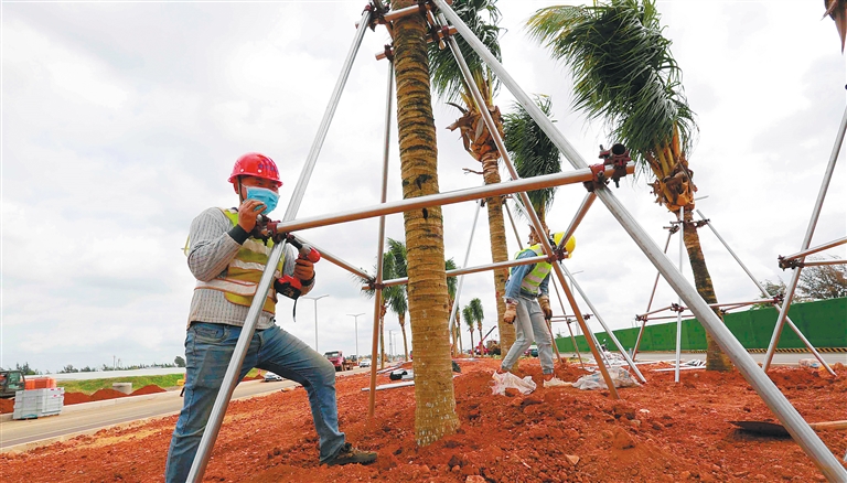 近日,在海口市江东大道,工人对刚刚栽植的椰子树进行固定。