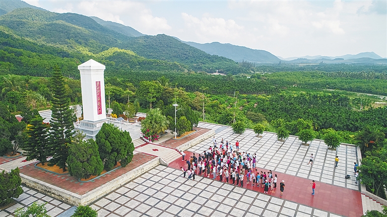 走进位于万宁市和乐镇六连村的六连岭革命根据地纪念园,园内松柏苍翠。拾级而上,呈方形塔状的六连岭烈士纪念碑矗立眼前,庄严肃穆,“革命烈士永垂不朽”8个大字镌刻其上,铭记六连岭的2000余位烈士英魂。