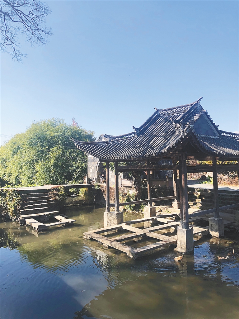 从菜街向河而下,只见河水清澈,参差水草,左右摇曳。岸边,两尺来宽的石板在水中搭出田字格,上面建有凉亭,这便是和顺最温情的公益建筑——洗衣亭。从清光绪年间开始,它们便为在此浣洗衣物的女人们遮阳避雨,是和顺外出经商的男人们送给家里女人独特而又温柔的礼物。