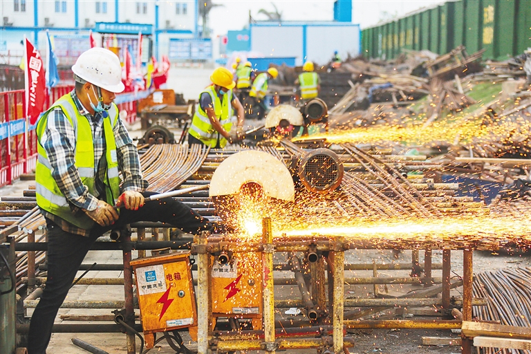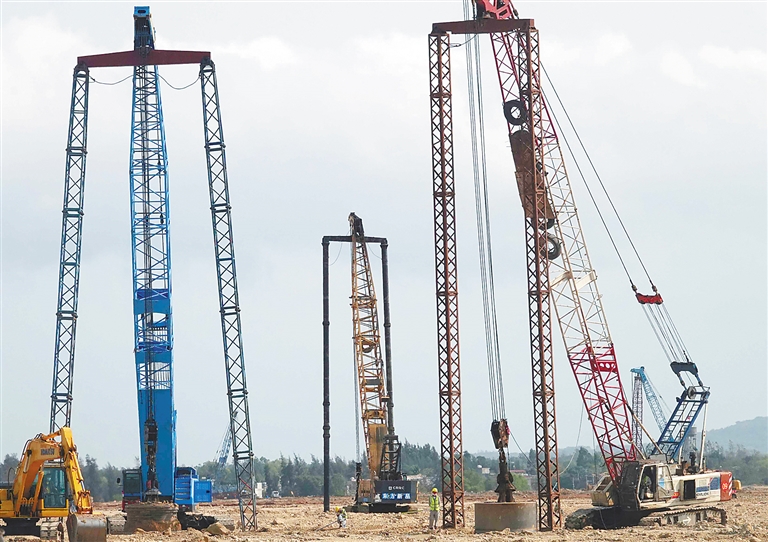 春光明媚,海风徐徐。海口江东新区的项目工地上,工程车来回穿梭,施工繁忙。