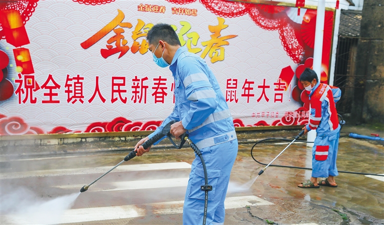近日,海口市琼山区甲子镇环卫工人对街道进行清洗杀菌。
