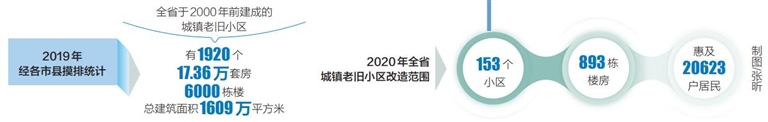 2019年,经各市县摸排统计,全省于2000年前建成的城镇老旧小区有1920个,涉及17.36万套房、6000栋楼,总建筑面积1609万平方米。