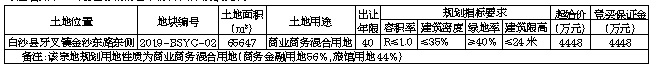 二、中华人民共和国境内外的法人、自然人和其他组织(法律另有限制的除外)均可申请参加竞买,申请人可单独申请,也可联合申请,属境外的法人、自然人和其他组织的,须提供境外公证部门的公证书及法律规定的其他文件。注:失信被执行人不得参加本次竞买。三、本次国有建设用地使用权挂牌出让设有底价,按照价高且不低于底价者得的原则确定竞得人,同一竞买人可多次报价竞买。四、本次挂牌出让的详细资料和具体要求,见挂牌出让文件。申请人可于2020年03月24日至2020年04月15日到白沙黎族自治县牙叉镇方溪路8号自然资源和规划局查询和购买《白沙黎族自治县国有建设用地使用权挂牌出让手册》,并按挂牌出让手册的具体要求申请参加竞买。五、申请人可于2020年03月24日至2020年04月15日到白沙黎族自治县牙叉镇方溪路自然资源和规划局向我局提交书面申请。交纳保证金的截止时间为2020年04月15日16时00分。经审核,申请人按规定交纳竞买保证金,具备申请条件的,我局将在2020年04月15日16时30分前确认其竞买资格。六、本次挂牌活动在海南省政府会展二楼省公共资源交易中心土地交易大厅进行。挂牌时间为:2020年04月07日09时00分起至2020年04月17日17时00分止;挂牌现场会时间为:2020年04月17日17时00分。七、其他需要公告的事项:(一)本次挂牌为上述地块按现状挂牌,具体面积以产权主管部门实际测量为准,多不退,少不补。(二)目前地块无附着物、无法律经济纠纷,土地开发利用规划条件明确,符合土壤环境质量要求,地块周边可以满足施工建设所需的水、电供应,相关设备、机械可以施工。(三)符合条件的竞买人填写竞买申请书,在规定期限内办理正式报名手续,并缴纳竞买保证金,报价最高且不低于底价者确定为该宗国有建设用地使用权竞得者,未竞得者保证金在挂牌结束后5个工作日内退还。(四)竞得者在足额缴纳全部成交价款和相关税费后,依照规定程序办理用地和土地登记手续。竞得者须从获得土地之日起半年内动工建设,宗地内整体建设必须在两年内完成。(五)竞得人须在成交当场签订《成交确认书》,并在30日内与我局签订《国有建设用地出让合同》,并按《国有建设用地出让合同》规定的时间缴清土地出让金。逾期未缴清土地出让金,将竞买保证金转为违约金,签订的《国有建设用地使用权出让合同》视为无效。(六)为白沙黎族自治县连续五年引进国际、国内顶级比赛(提供佐证材料)。(七)为白沙黎族自治县引进四个以上体育项目的国家级训练基地。每年确保两支以上国家队在白沙黎族自治县冬训(提供佐证材料)。(八)该地块用于白沙黎族自治县体育中心附属设施建设,主要建设内容及功能有大堂接待处、餐厅、会议中心、专家楼、运动员公寓、协会办公楼及其他配套服务设施。(九)该宗地若实施装配式建筑,须按装配式建筑有关规定进行。(十)竞得人须与我县旅游和文化广电体育局签订海南省产业项目发展和用地准入协议书。八、税金按税法规定交纳,土地交易服务费按规定收取,前期费用(包括测量费、土地评估费、节约用地评估费等)由竞得者交纳。九、联系方式与银行账户:联系地址:白沙黎族自治县牙叉镇方溪路自然资源和规划局8号。联系人:黄女士;联系电话:0898-27715862。查询网址:http://zw.hainan.gov.cn/ggzy;http://www.landchina.com。开户单位:白沙黎族自治县土地开发整理储备中心;开户银行:海南省银行股份有限公司白沙支行;银行账号:6002578100018