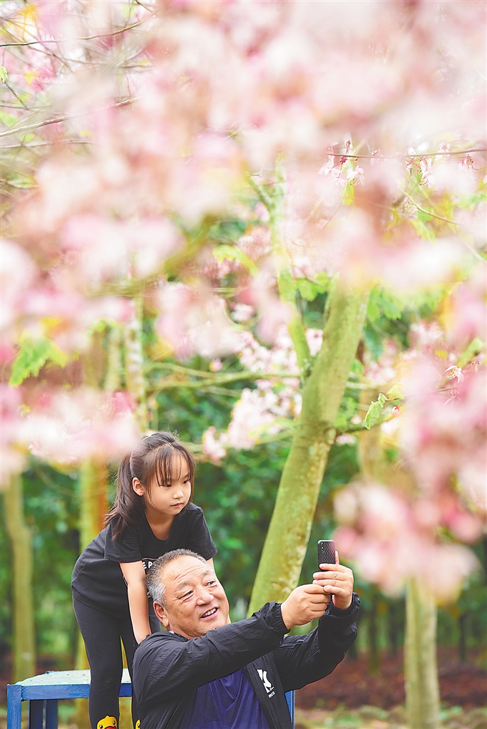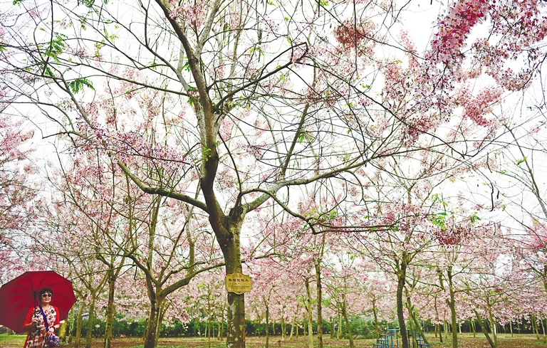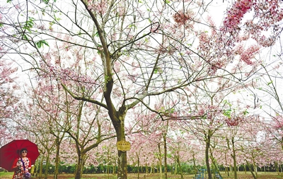3月15日,琼海市塔洋镇大顺农场樱花园对外开放,千树樱花竞放吸引游人冒雨赏花踏春。