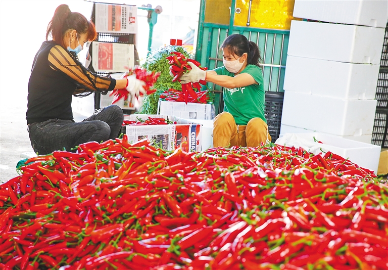 据统计,从2月13日至今,定城镇累计销售辣椒、苦瓜、豇豆等冬季瓜菜9280.2吨。目前,农户丰收的瓜菜主要运往河南、北京、四川以及广东等地。 本报记者 张茂 摄