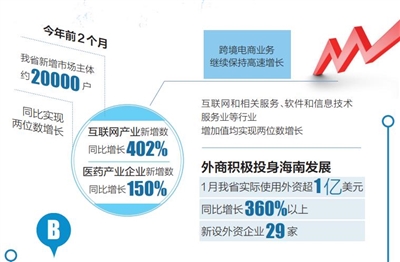 省市场监管局和省商务厅提供的统计数据显示,今年前2个月,我省新增市场主体约2万户,同比实现两位数增长;外商积极投身海南发展,其中1月我省实际使用外资超1亿美元,同比增长360%以上,新设外资企业29家。