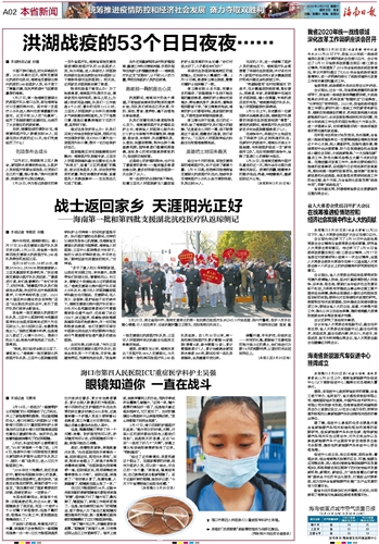 3月17日,海口四院的护理医疗队返琼。“离开武汉的时候,天啊,对面小区的居民都站在阳台上跟我们告别”,说起那天的场景,这位“90后”一连用了好几个“天啊”,惊喜之情从电话线那端清晰地传了过来,“特别感动”。