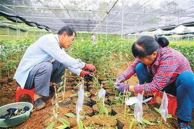| 近日,定安县龙湖镇一个苗圃基地,农户在嫁接沉香苗。