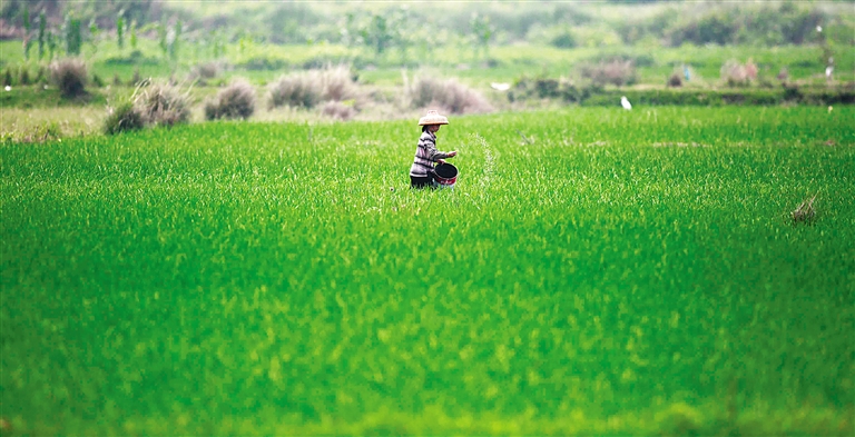 | 3月20日,儋州市新州镇南岸村的一块稻田内,一位村民在田间给水稻施肥。