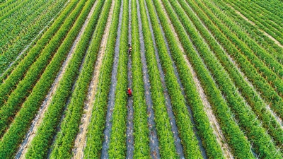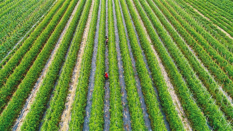 | 近日,定安县定城镇一个蔬果种植基地,农户在进行田间管理。