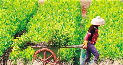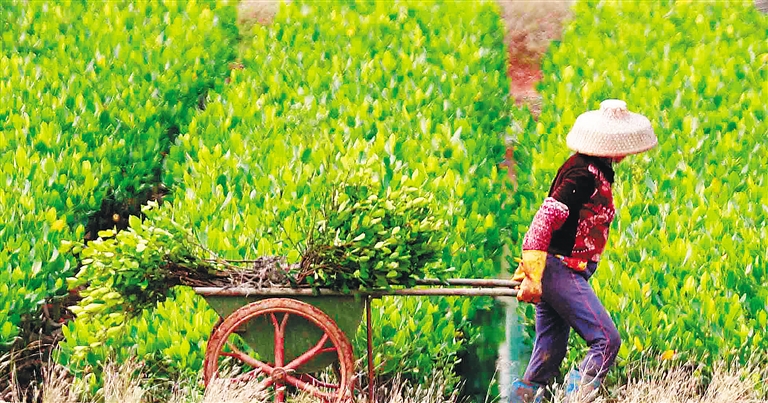 | 近日,儋州市白马井镇藤根村红树林种苗基地,工人在培育红树林苗。本报记者 陈元才 摄 |