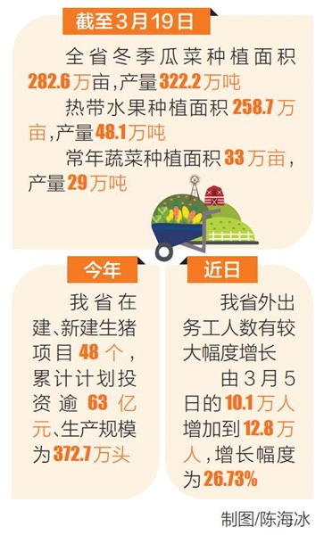 据省农业农村厅统计,截至3月19日,全省冬季瓜菜种植面积282.6万亩,收获255.1万亩,产量322.2万吨;热带水果种植面积258.7万亩,投产面积222万亩,收获44万亩,产量48.1万吨;常年蔬菜种植面积33万亩,收获31.5万亩,产量29万吨;主要粮食作物播种面积143.6万亩。