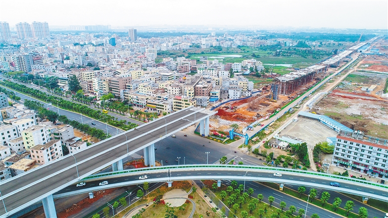 日前,高空俯瞰复工后的海口市海秀快速路二期项目施工现场,工人正在抓紧进行现浇箱梁支架搭设和模板安装工作。