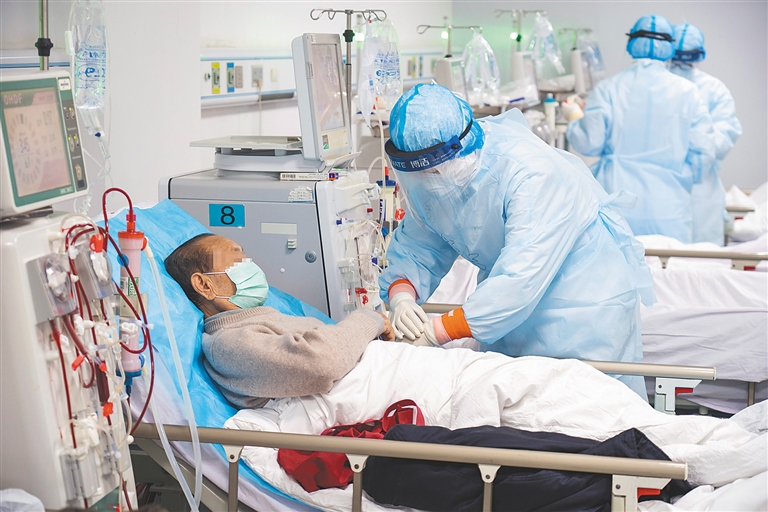 新冠肺炎疫情发生以来,武汉市汉口医院肾内科血液透析中心的8名医护人员全力守护病患者的生命健康。近日,医护人员除了负责新冠肺炎危重症患者血液净化治疗,每周还会为近40名处于新冠肺炎康复期的尿毒症患者做透析。据了解,尿毒症患者在感染新冠肺炎后仍需每周做三次血液透析。 新华社记者 才扬 摄