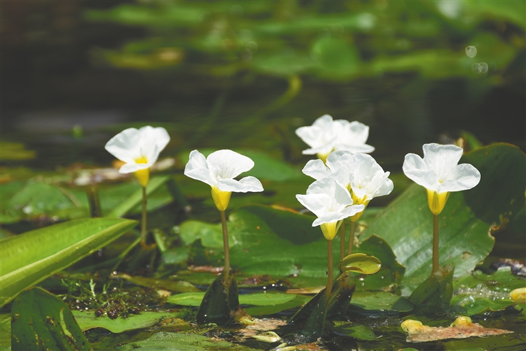 若论“娇气”,个头瘦小的水菜花更是有过之而无不及。靠近五源河下游的一处石桥边,几株水菜花漂浮或半沉于水面,一阵微风拂过,柔嫩的花瓣摇曳不止,显得楚楚可怜。因对生长环境要求苛刻,且在无污染的清水中才能正常生长和开花,这种浮萍般的小花由此落了个“天然水质监测员”的别称。