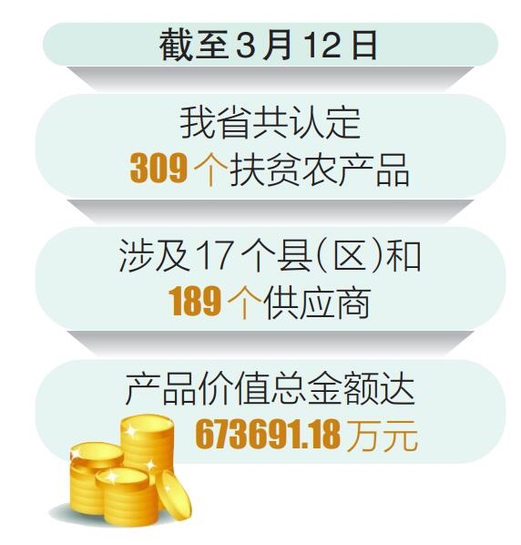 省扶贫办相关负责人介绍,今年以来,海南加大消费扶贫推进力度,在贫困地区重点抓好扶贫产品的认定和监管,组织贫困群众发展市场有需求、本地有优势的特色扶贫产品,打造品牌,提高质量,保障供给。截至3月12日,共认定309个扶贫农产品,涉及17个县(区)和189个供应商,产品价值总金额达673691.18万元。