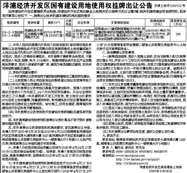 洋浦经济开发区国有建设用地使用权挂牌出让公告