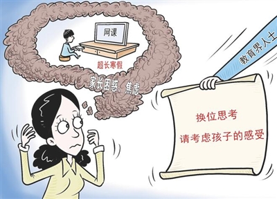 笔者与许多家长交流后发现,放寒假后,许多孩子待在家中已经两月有余。孩子放假在家,家庭生活的规律节奏被打乱,网课的实施也给许多家长带来困扰。许多处于学前期(0—5岁)的孩子太闹太吵太粘人,让一些家长经常处于崩溃的边缘;处于学龄期(6—18岁)的孩子最让家长操心劳神的是网课学习缺乏主动性,居家日久相看两厌。