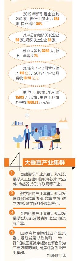 2019年,园区新引进企业约200家,累计注册企业784家,同比增长34%。其中,总部经济关联企业50家,规模以上企业33家;就业人数约3260人,较上一年增长7%,为推动我省经济高质量发展作出了贡献。