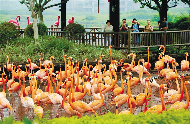 3月23日,几位游客在澄迈县海南富力红树湾湿地公园拍摄观赏火烈鸟。本报记者 苏晓杰 通讯员 王家专 图\文