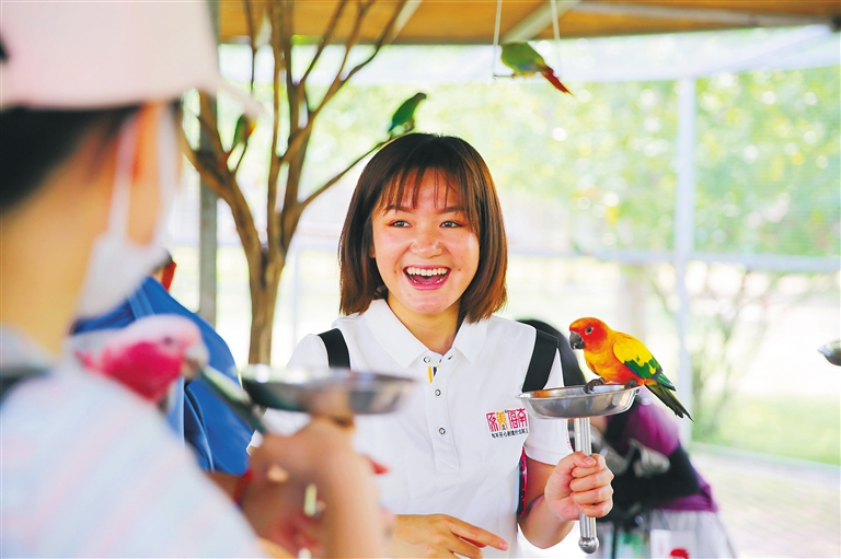三月二十六日,省旅文厅主办的“战胜疫情·拥抱阳光”海南人游海南活动启动。图为在海口桂林洋天鹅湖动物基地,游客与动物互动。