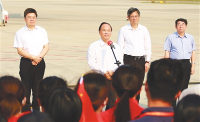 欢迎仪式结束后,医护人员乘车前往集中休整点。刘赐贵等省领导向他们挥手致意,目送车队离开。